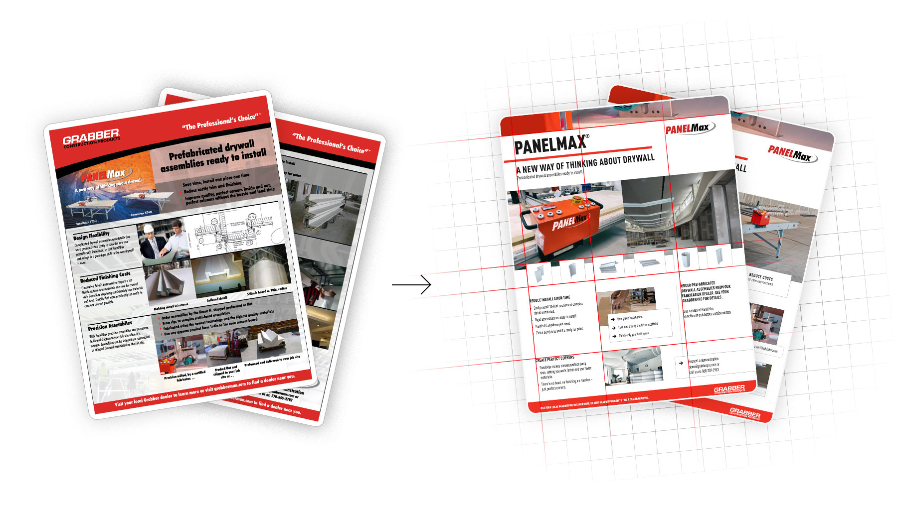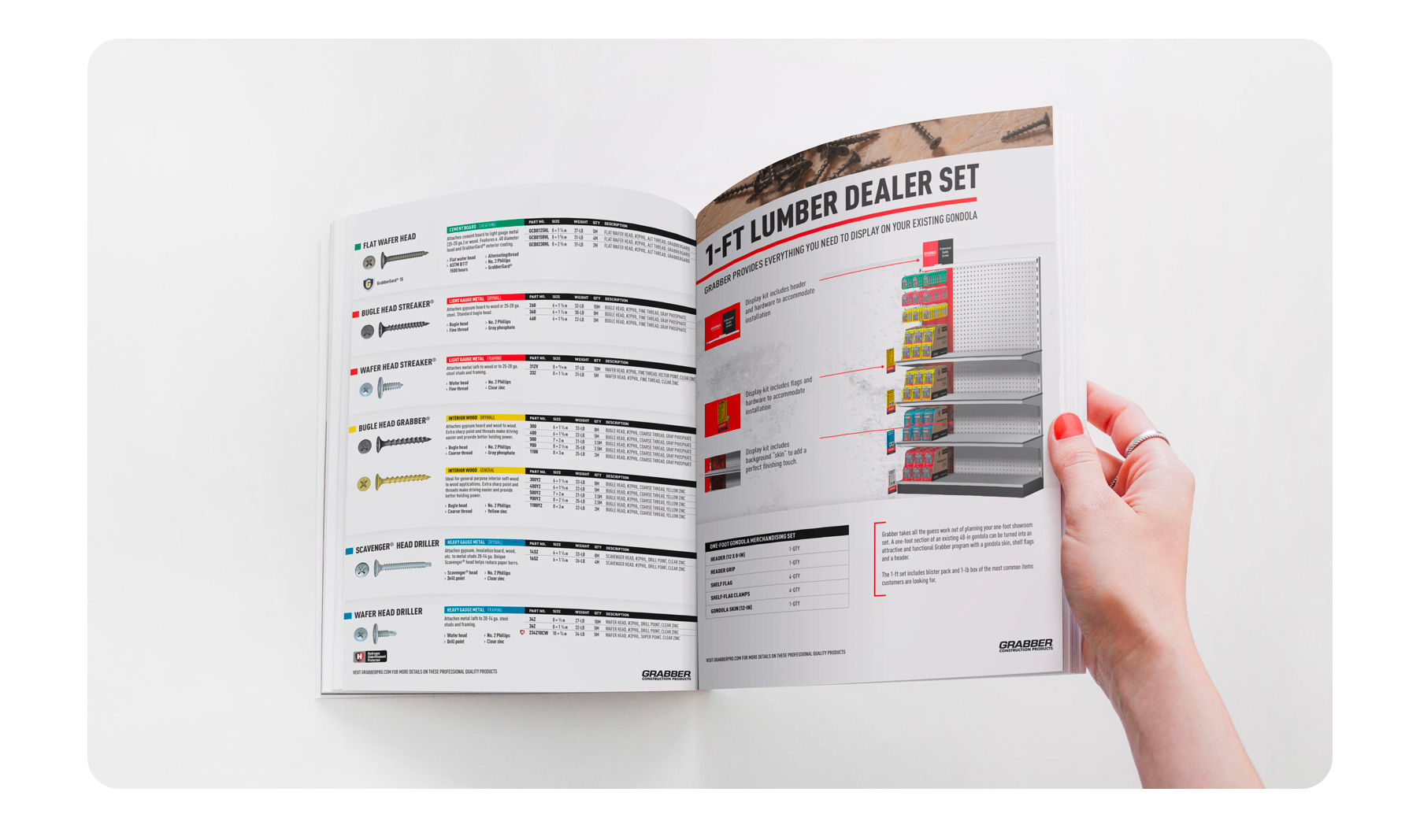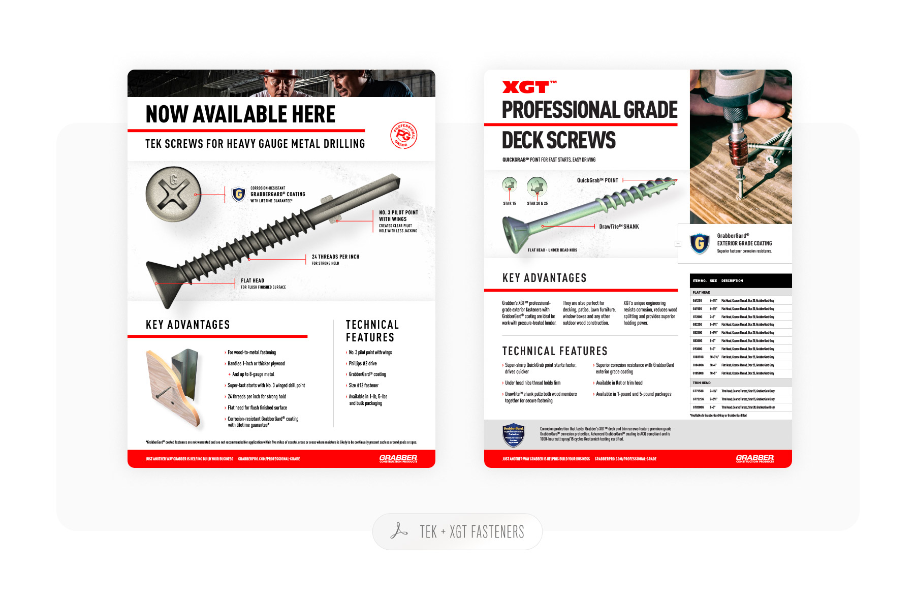 Grabber wanted to refresh their promotional brochures for both new and classic products with a streamlined, templated approach. Template products included fasteners (screws), caulk, framing collars, tools for fabrication, specialty fasteners, drywall assembly, and Grabber's proprietary SuperDrive line. Additional brochures included product training materials, corner & trim products, trash/debris carts, long-form catalog's and more! The solution was a modern clean and readable format that helped customers learn about new and existing products.
